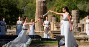 Tegucigalpa,Honduras lunes 25 octubre 2021 La actriz griega Xanthi Georgiou (d), en el papel de Suma Sacerdotisa, sostiene la antorcha durante la ceremonia de encendido de la llama Olímpica para los juegos olímpicos de Invierno de Tokio 2022 en la antigua Olimpia del Peloponeso, al sur de Grecia. Fuente: La …