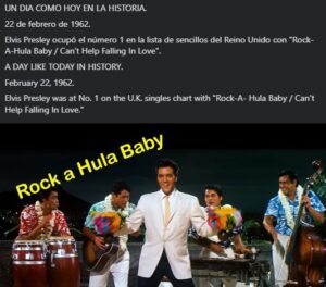 22 de febrero de 1962. Elvis Presley ocupó el número 1 en la lista de sencillos del Reino Unido con “Rock-A-Hula Baby / Can’t Help Falling In Love”. radio-mickyandonie 22 febrero, 2026 Un dia como hoy en la Historia de la Musica Leave a comment 325 Views Share Facebook Twitter Stumbleupon LinkedIn Pinterest