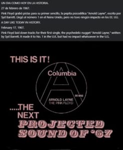 27 de febrero de 1967. Pink Floyd grabó pistas para su primer sencillo, la pepita psicodélica “Arnold Layne”, escrita por Syd Barrett. Llegó al número 1 en el Reino Unido, pero no tuvo ningún impacto en los EE. UU.