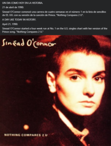 com21 de abril de 1990. Sinead O’Connorenzó una carrera de cuatro semanas en el número 1 en la lista de sencillos de EE. UU. con su versión de la canción de Prince, “Nothing Compares 2 U”.