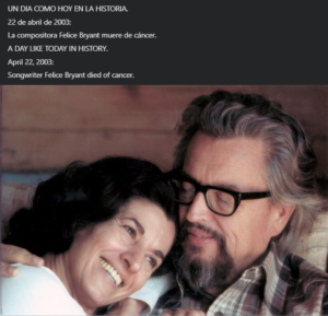 22 de abril de 2003. La compositora Felice Bryant muere de cáncer. radio-mickyandonie 3 horas ago Un dia como hoy en la Historia de la Musica Leave a comment 779 Views Share Facebook Twitter Stumbleupon LinkedIn Pinterest