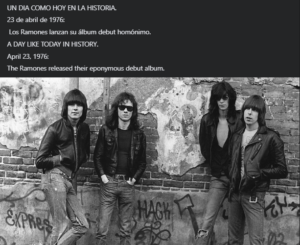 23 de abril de 1976. Los Ramones lanzan su álbum debut homónimo. radio-mickyandonie 2 horas ago Un dia como hoy en la Historia de la Musica Leave a comment 934 Views Share Facebook Twitter Stumbleupon LinkedIn Pinterest