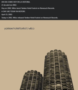 23 de abril de 2002. Hoy en 2002, Wilco lanzó Yankee Hotel Foxtrot en Nonesuch Records. radio-mickyandonie 2 horas ago Un dia como hoy en la Historia de la Musica Leave a comment 423 Views Share Facebook Twitter Stumbleupon LinkedIn Pinterest