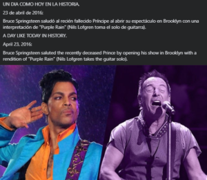 23 de abril de 2016. Bruce Springsteen saludó al recién fallecido Príncipe al abrir su espectáculo en Brooklyn con una interpretación de “Purple Rain” (Nils Lofgren toma el solo de guitarra).