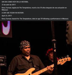 23 de abril de 2017. Kerry Turman, bajista de The Temptations, murió a los 59 años después de una actuación en Missouri. radio-mickyandonie 2 horas ago Un dia como hoy en la Historia de la Musica Leave a comment 366 Views Share Facebook Twitter Stumbleupon LinkedIn Pinterest