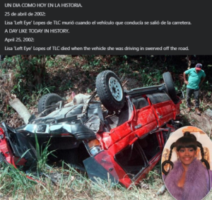 25 de abril de 2002. Lisa ‘Left Eye’ Lopes de TLC murió cuando el vehículo que conducía se salió de la carretera. radio-mickyandonie 22 horas ago Un dia como hoy en la Historia de la Musica Leave a comment 217 Views Share Facebook Twitter Stumbleupon LinkedIn Pinterest