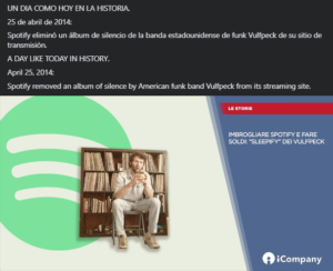 25 de abril de 2014. Spotify eliminó un álbum de silencio de la banda estadounidense de funk Vulfpeck de su sitio de transmisión. radio-mickyandonie 21 horas ago Un dia como hoy en la Historia de la Musica Leave a comment 201 Views Share Facebook Twitter Stumbleupon LinkedIn Pinterest