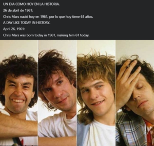 26 de abril de 1961. Chris Mars nació hoy en 1961, por lo que hoy tiene 61 años. radio-mickyandonie 3 horas ago Un dia como hoy en la Historia de la Musica Leave a comment 280 Views Share Facebook Twitter Stumbleupon LinkedIn Pinterest