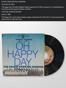 26 de abril de 1969. “Oh Happy Day” de Edwin Hawkins Singers ingresó al Hot 100 en el puesto 72, convirtiéndose en la primera canción gospel en llegar a esa lista. radio-mickyandonie 3 horas ago Un dia como hoy en la Historia de la Musica Leave a comment 910 Views Share Facebook Twitter Stumbleupon LinkedIn Pinterest