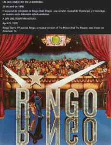 26 de abril de 1978. El especial de televisión de Ringo Starr, Ringo , una versión musical de El príncipe y el mendigo , se muestra en la televisión estadounidense. radio-mickyandonie 3 horas ago Un dia como hoy en la Historia de la Musica Leave a comment 414 Views Share Facebook Twitter Stumbleupon LinkedIn Pinterest
