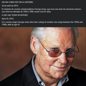 26 de abril de 2013. El cantante de country estadounidense George Jones, que tuvo una serie de canciones número uno entre las décadas de 1950 y 1990, murió a los 81 años.