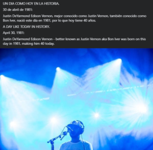 30 de abril de 1981: Justin DeYarmond Edison Vernon, mejor conocido como Justin Vernon, también conocido como Bon Iver, nació este día en 1981, por lo que hoy tiene 40 años.